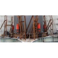 液压提升器采用自锁式液压千斤顶和提升架、提升杆组成的液压提升机,当液压千斤顶进油时,通过其上卡头卡紧并举起提升杆和胀圈,从而带动罐体(包括罐顶)向上提升;当千斤顶回油时,其上卡头随活塞杆回程,此时其下卡头自动卡紧提升杆不会下滑,千斤顶如此反复运动使提升杆带着罐体不断上升,直到预定的高度(空出下一层板的高度)。当下一层壁板对接组焊后,打开液压千斤顶的上、下松卡装置,松开上下卡头将提升杆以及胀圈下降到下一层壁板下部胀紧、焊好传力筋板,再进行提升。如此反复,使已组焊好的罐体上升,直到 后一层壁板组焊完成,从而将整个储罐安装完哔。