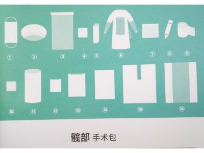 手术包配置:一次性使用医用口罩1个、一次性使用帽1个、器械盘套1条、擦手巾(40*40cm)4块、备胶料(10*50cm)2条、一次性使用手术衣(加强型)2件、集液袋1个、医用记号笔1支、弹性绷带1卷、纱布块5块、脚套1双、U型单1条、脚单1条、边单4条、麻醉单1条、一次性使用包布1条。