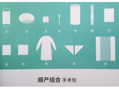 手术包配置:一次性使用医用口罩1个、一次性使用帽1个、纱布块4块、医用棉签4支、鞋套1双、婴儿护脐贴1包、一次性使用手术衣1件、一次性使用医用垫单4条、机制垫单(45*60cm)1条、机制垫单(60*60cm)1条、脚套1双、一次性使用包布1条。