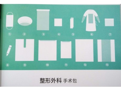 手术包配置:一次性使用医用口罩1个、一次性使用帽1个、器械盘套1条、擦手巾(40*40cm)4块、备胶料(10*50cm)2条、一次性使用手术衣(加强型)2件、积液袋2个、医用记号笔1支、U型单1条、脚单1条、边单4条、麻醉单1条、一次性使用包布1条。