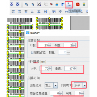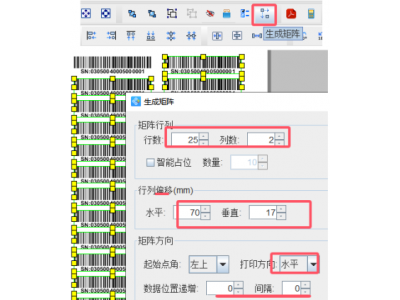 这样做出来的条形码扫描出来的内容就是:0305004005000001不带SN:。选中这个条形码,点击“生成矩阵”图标,弹出的窗口中,设置25行2列,调整要阵列的每个条形码的偏移距离(或者是间隔),阵列方向,然后点确定,阵列出来剩余的49个条形码。