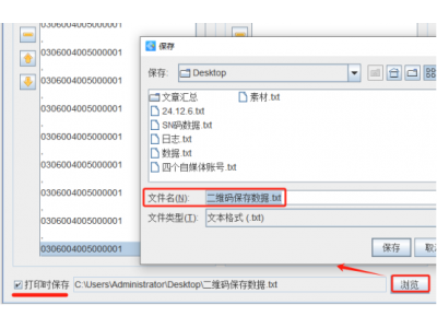 3. 二维码数据源中数据添加完成之后,将下面的“打印时保存”勾选上,点击后面的“浏览”按钮,设置打印时保存数据的文件保存位置和文件名称。