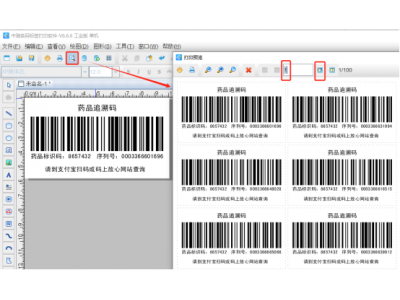 6. 制作完成之后,点击软件顶部的“打印预览”按钮,翻页查看批量生成的药品追溯码标签,预览无误就可以直接连接打印机打印出来了。
