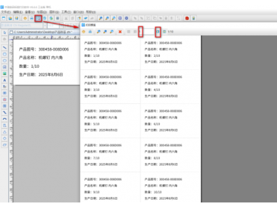 7. 制作完成之后,点击软件顶部工具栏中的“打印预览”按钮,翻页查看批量生成的产品标签,预览无误就可以直接连接打印机打印出来了。